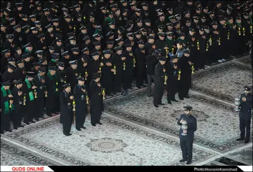 قم - آیین خطبه خوانی خادمان حرم حضرت معصومه (س) در آستانه ماه محرم، روز پنجشنبه با حضور آیت الله سید محمد سعیدی تولیت حرم کریمه اهل بیت(ع) و برخی از مسئولان در شبستان امام خمینی(ره) این مکان مقدس برگزار شد.