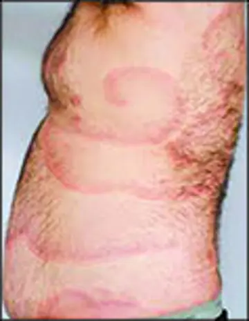 مردی 26ساله با سابقه‌ی 3ساله‌ی پدیدارشدن راجعه‌ی صفحات گسترش یابنده‌ی حلقوی و چرخان روی سر، گردن، تنه و اندام‌های پروگزیمال مراجعه کرد.
